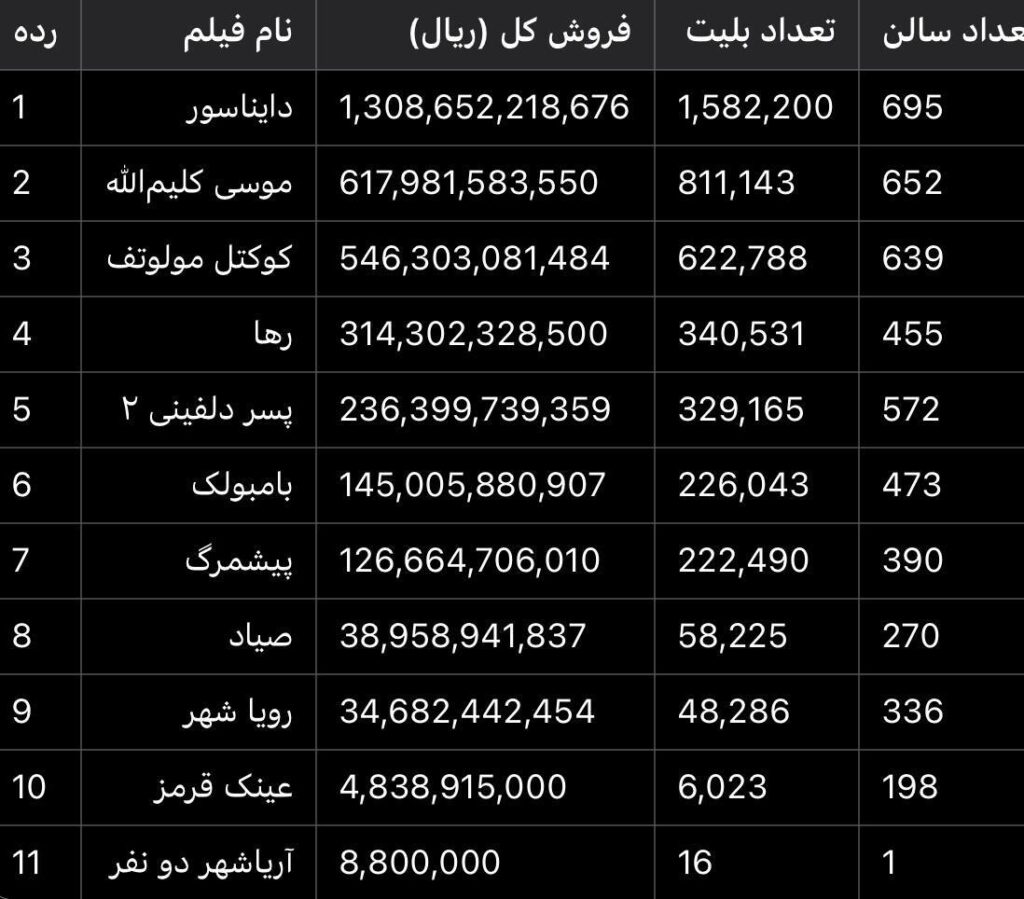 ثبات در چینش سه فیلم پرفروش هفته شاید در نگاه نخست نشانهای از اقبال مخاطب به آثار خاص باشد، اما در واقع، این سکون نشانه رکود است. در صدر جدول، «دایناسور» با کارگردانی مسعود اطیابی، با وجود کاهش محسوس فروش نسبت به هفته اول (که بیش از ۹ میلیارد تومان بود)، همچنان با اقتدار پرفروشترین فیلم هفته باقی ماند. در رتبه دوم، «موسی کلیمالله» ساخته ابراهیم حاتمیکیا قرار دارد؛ فیلمی تاریخی که با فروش ۴ میلیارد و ۲۳۴ میلیون تومان در همین هفته، هنوز از نظر فروش کل، با اختلاف ۶۹۰ میلیارد ریالی از صدرنشین عقبتر است؛ و سومین فیلم جدول، «کوکتل مولوتف» با ۶۲۲ هزار بلیت و بیش از ۵۴۶ میلیارد ریال فروش، ثابت میکند که کمدیهای پرهیاهو هنوز میتوانند کورسویی در این تاریکی باشند.