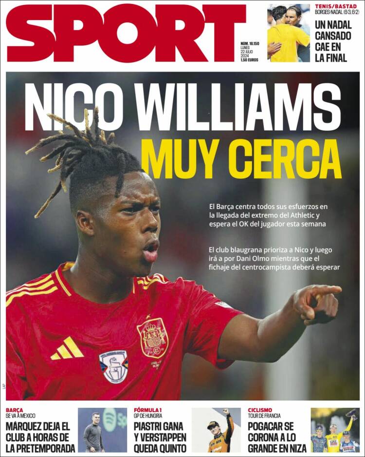 تیتر یک امروز اسپورت به نیکو ویلیامز ارتباط دارد و این نشریه نزدیک به بارسلونا ادعا کرده است که انتقال ستاره اسپانیایی در روزهای پیش رو نهایی میشود.