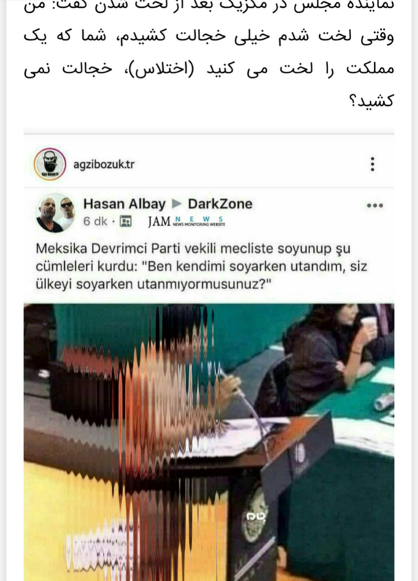 امروز، تصویری با مضمون لخت شدن یک نماینده مجلس مکزیک در اعتراض به فقر و فساد در فضای مجازی دست به دست شد.بررسی ها نشان داد این تصویر صحت دارد ولی قدیمی و مربوط به دستمبر ۲۰۱۳ است و داستان متفاوتی دارد، آن زمان در جریان تصویب قانونی جدید در صنعت نفت مکزیک، آنتونیو گارسیا، یکی از نمایندگان مخالف این لایحه، به نشانه اعتراض لباس‌های خود را در صحن علنی مجلس درآورد و اقدام نمادین را به عنوان نشانه‌ای از «لخت‌شدن منابع طبیعی در مکزیک» انجام داد.