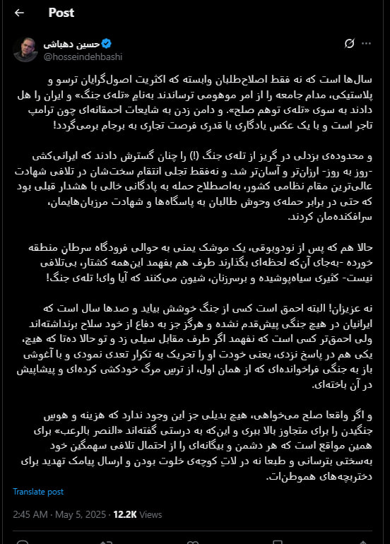 حسین دهباشی در یادداشتی پرحرارت، با انتقاد شدید از جریانهایی که در برابر تجاوز و دشمنی، به نام «ترس از جنگ» دست به عقبنشینی زدهاند، مینویسد: “ایران را از هراس جنگ به سوی خودکشی تدریجی کشاندهاند، غافل از اینکه صلح بدون بازدارندگی، فقط دعوت به تکرار جنایت است.” او با اشاره به حملههای بدون پاسخ به مرزها و تکیه بر امیدهای واهی، سیاست مداراگرایانهی برخی مسئولان را «بزکِ بزدلی» میخواند.
