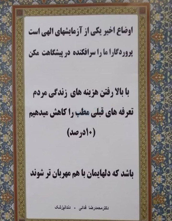دکتر محمدرضا فدائی در اقدامی خداپسندانه و مهربانانه به دلیل افزایش قیمت‌ها، ده درصد از ویزیت پیشین خود را به بیماران تخفیف داده است.