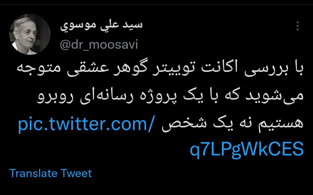 یکی از فعالان فضای مجازی درباره توییت منسوب به گوهر عشقی نوشت: با بررسی اکانت توییتر گوهر عشقی متوجه میشوید که با یک پروژه رسانهای روبرو هستیم نه یک شخص!