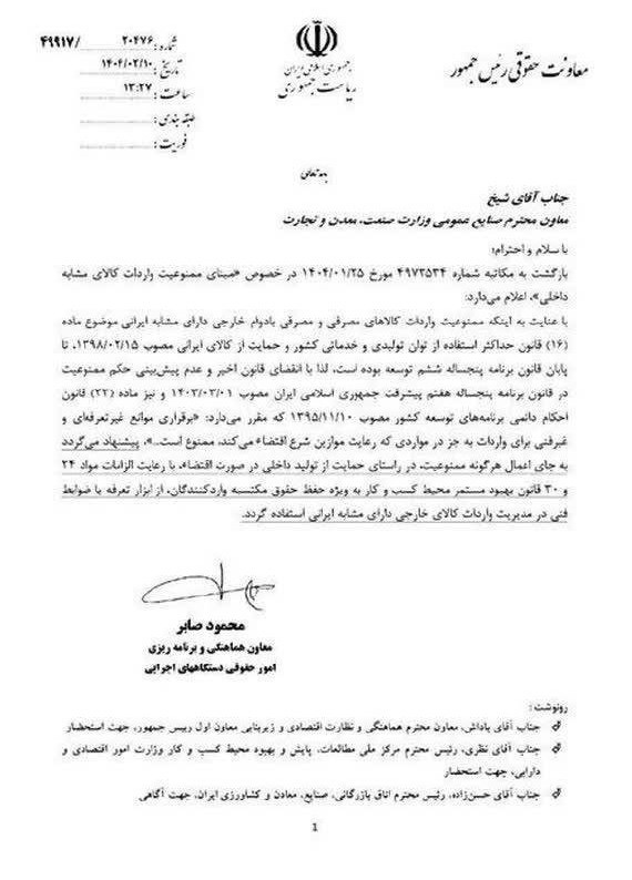 فرمایشات رهبری در حالی بارها درباره حمایت از کالای ایرانی بوده است که نامه ای عجیب از سوی معاونت حقوقی رئیس جمهور به وزارت صمت ارسال شده که در آن نامه تأکید شده است که “ممنوعیت واردات کالای مشابه داخلی” تا پایان برنامه ششم بوده است و حال حاضر در برنامه هفتم خبری از این موضوع نیست, بنابراین اجرای آن ضرورتی ندارد.