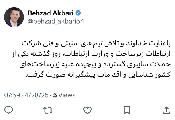 به گزارش جهت پرس؛ به گزارش خبرنگار گروه علم و پیشرفت خبرگزاری فارس، بهزاد اکبری مدیرعامل شرکت ارتباطات زیرساخت در توییتی در صفحه مجازی خود از حمله سایبری به زیرساخت‌های کشور خبر داد.اکبری نوشت: «با عنایت خداوند و تلاش تیم‌های امنیتی و فنی وزارت ارتباطات، یکی از گسترده‌ترین و پیچیده‌ترین حملات سایبری علیه زیرساخت‌های کشور روز گذشته شناسایی و با اقدامات پیشگیرانه، از بروز آسیب‌های احتمالی جلوگیری شد.»
