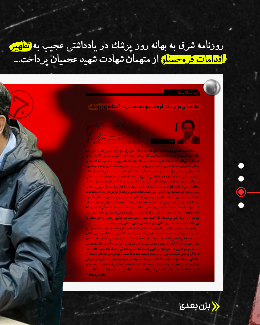 روزنامه شرق به بهانه روز پزشک در یادداشتی عجیب به تطهیر اقدامات قرهحسنلو از متهمان شهادت شهید عجمیان پرداخت…