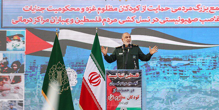 سرلشکر حسین سلامی فرمانده کل سپاه پاسداران عصر امروز (شنبه، 27 آبانماه) در جمع راهپیمایان حاضر در تجمع ضد صهیونیستی که در میدان انقلاب تهران برگزار شد، گفت: امروز همه ایران اسلامی سرشار از محبت، عاطفه، احساس عمیق، غیرت دینی و تعصب الهی برای حمایت از کودکان شریفترین مردمان روی زمین فلسطین عزیز است.