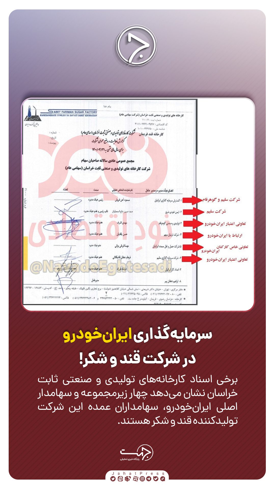 برخی اسناد کارخانه های تولیدی و صنعتی ثابت خراسان نشان می دهد چهار زیرمجموعه و سهامدار اصلی ایرانخودرو، سهامداران عمده این شرکت تولیدکننده قند و شکر هستند.