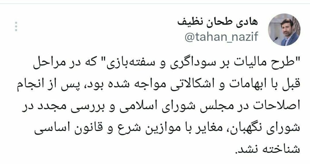 “طرح مالیات بر سوداگری و سفتهبازی” که در مراحل قبل با ابهامات و اشکالاتی مواجه شده بود، پس از انجام اصلاحات در مجلس شورای اسلامی و بررسی مجدد در شورای نگهبان، مغایر با موازین شرع و قانون اساسی شناخته نشد.