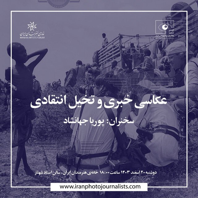 نشست «عکاسی خبری و تخیل انتقادی» توسط انجمن صنفی عکاسان مطبوعاتی ایران با سخنرانی پوریا جهانشاد، ساعت ۱۸ دوشنبه ۲۰ اسفند ۱۴۰۳ در سالن استاد شهناز خانه هنرمندان ایران برگزار خواهد شد.
