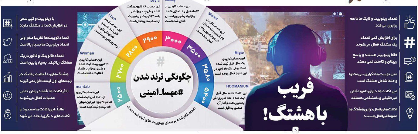 اگر کسی روزانه میزان تعداد توییت ارسال شده روی هشتگهای ترند در سطح جهانی را نگاهی بیندازد متوجه میشود به صورت طبیعی بین ۱۰تا۵۰هزار توییت روی این هشتگها ارسال شده است. برای ترند شدن البته صرف تعداد توییتها مهم نیست و عوامل دیگری همچون بازه زمانی ارسال این تعداد توییت (سرعت رشد و انتشار)، گسترش هشتگ یا موضوع به سایر پیامرسانها و رسانههای اجتماعی و به طور قطع برخی سیاستها و اولویتهای مالی و تبلیغاتی خود شرکت توییتر نیز دخالت دارد. اگر کسی روند تبلیغات توییتری را مستقیم با خود شرکت توییتر پیش ببرد و هزینه تبلیغ یک محتوای خاص را به آن بدهد، توییتر با نگاهی خوشبینانه به آن برخی محدودیتها را برایش حذف میکند. براین اساس میتوان پیشبینی کرد که به آسانی و با ارسال تنها حدود ۱۰هزار توییت در یک بازه زمانی کوتاه روی هشتگ یا موضوعی که با سیاستها و اولویتهای توییتر هماهنگ بوده و احتمالا تأمین هزینههای تبلیغاتی آن نیز مستقیم با شرکت توییتر انجام شده است یک هشتگ، ترند جهانی شود. توییتر با آزاد گذاشتن آیپیهایش (آدرس رابط بین توییتر و رباتهای مدیریت حساب کاربری و انتشار) مدتها اجازه استفاده از رباتها برای ارسال محتوا را در دسترس همگان قرار داده بود. اما چند سال پیش بود که این شرکت همه آیپیهایش را بست و اعلام کرد از این پس اجازه استفاده از این امکان را تنها به افراد یا مجموعههایی میدهد که ابتدا نوع فعالیت و اهدافشان را برای توییتر روشن کرده و اسناد هویتی خودشان را نیز ارائه بدهند. این مسأله در نگاه اول به معنای پایان یافتن انتشار رباتیک گسترده در توییتر به نظر میرسید اما از همان روزهای اول اعمال این سیاست جدید، همچنان انتشار گسترده و تبلیغاتی (به اصطلاح انتشار Spamming) برخی محتواها در فضای توییتر انجام میشد که نشان از آن داشت که برخی رباتها بدون نیاز به آیپی توییتر و با اتصال مستقیم همزمان به چند حساب کاربری همان روند مدیریت حسابهای کاربری و انتشار گسترده را انجام میدهند. بر این اساس حالا باید بدانیم که هشتگ مهسا امینی از ۲۳شهریور آغاز شده و دوم مهرماه با ۴ میلیون توییت و هفتم مهرماه با سه میلیون و ۹۵۰هزار و هشتم مهرماه با نزدیک به سهمیلیون و ۹۰۰ هزار توییت و ریتوییت به اوج رسید. هر چند حالا این هشتگ از ۳۰۰ میلیون بار گذشته اما در برههای این هشتگ در حالی به ۱۷۲ میلیون رسید که این تعداد توسط فقط یک میلیون و صدهزار اکانت توییتری صورت گرفته است. مصداقهای بسیاری در این رابطه میتوان به چشم دید، به عنوان مثال اکانتی که در سپتامبر ۲۰۲۲ (۲۶ شهریور امسال) ثبت و فعال شده و طی ۱۵ روز ۲۷۰۰ توییت ثبت کرده است. یا اکانت دیگری که در روزهای اخیر نام کاربریاش را تغییر داده و با اینکه اکانت آن هشت سال پیش ثبت شده اما کل ۱۷هزار توییت آن به کمتر از یک ماه اخیر تعلق دارد. از این دست نمونهها در روزهای اخیر بسیار است. اما نشانههای دیگری هم در رباتیک بودن ترند شدن یک هشتگ در توییتر وجود دارد. به عنوان مثال تعداد توییت و لایکها با هم برابری میکند و کاربران عموما فقط ریتوییتر هستند و پاسخ دارای نام و نشان غیرحقیقی و نامشخص هستند و تعداد توییتهای این اکانتها تقریبا صفر ولی تعداد ریتوییتها بسیار بالاست. از جمله نشانههای آشکار دیگر در این میان این است که تعداد فالوئینگ و فالوئر اکانتهای برتر شرکتکننده در یک هشتگ رباتیک، بسیار پایین است. البته برای بسیاری روشن است که اکثر اکانتها از چند ماه پیش از عملیات توییتری، ایجاد شده و فقط در همان زمان خاص عملیات فعال میشوند. موضوع دیگری که در این عملیات توییتری مشخص است حضور پررنگ اکانت های منافقین مستقر در آلبانی و اکانتهای سعودی است که حضور پررنگی در این پروسه دارند و اصل پیشبرد این عملیات فریب توسط این ۲جریان توییتری در حال انجام است. بررسی کارشناسان نیز تایید کننده این سخن است. فریب پر تعداد بودن را نخوریم که همه چیزشان فیک است!
