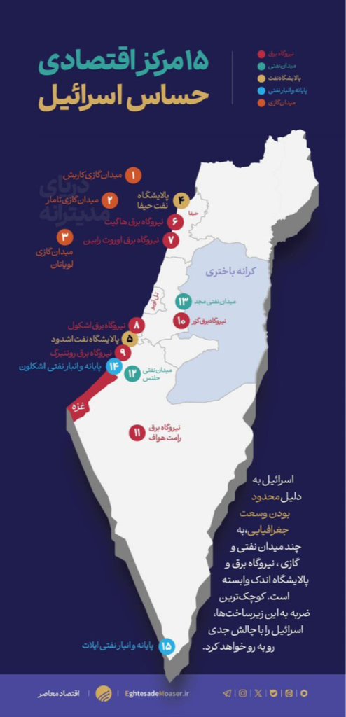 ۸۰ درصد همه زیرساخت‌های انرژی اسرائیل به ۷ نقطه محدود می‌شود و ایران شب گذشته با حمله به ساختمان کریاه نشان داد، همه خاک سرزمین‌های اشغالی در دسترس است.