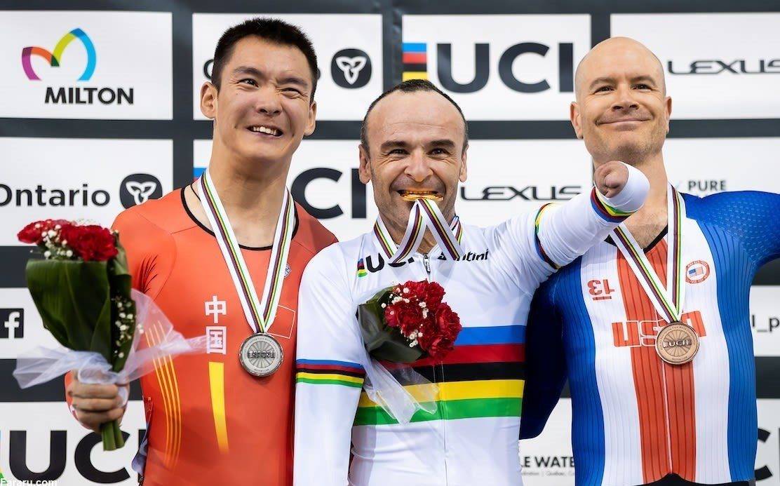 دوچرخه سوار معلول اسپانیایی در مسابقات جهانی قهرمان شد و با وجود اینکه هر دو دست او قطع شده ساعت مچی جایزه گرفت.