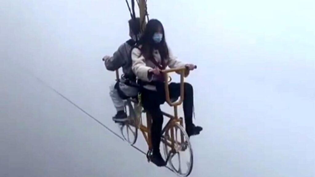 به گزارش جهت، به تازگی، فیلمی جدید از یک مرکز تفریحی در کوهستانهای کشور چین منتشر شده است که در آن، یک پسر و دختر، روی کابل ترن هوایی دوچرخه سواری میکنند.