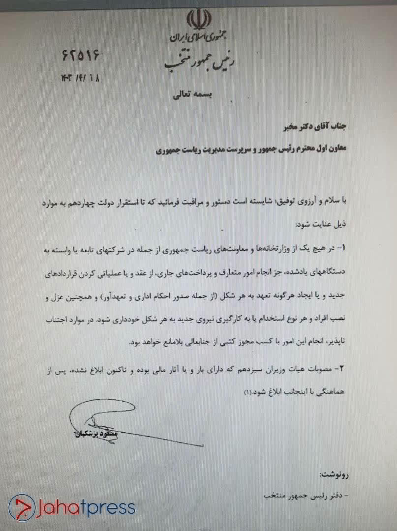 اطرافیان رئیسجمهور منتخب نامهای را به رسانهها درز دادهاند که در آن آقای پزشکیان در نامه به محمد مخبر، سرپرست ریاستجمهوری خواستار عدم عزل و نصب نیروهای جدید و یا عقد قرارداد و ایجاد بار مالی تا زمان استقرار دولت جدید شده است.