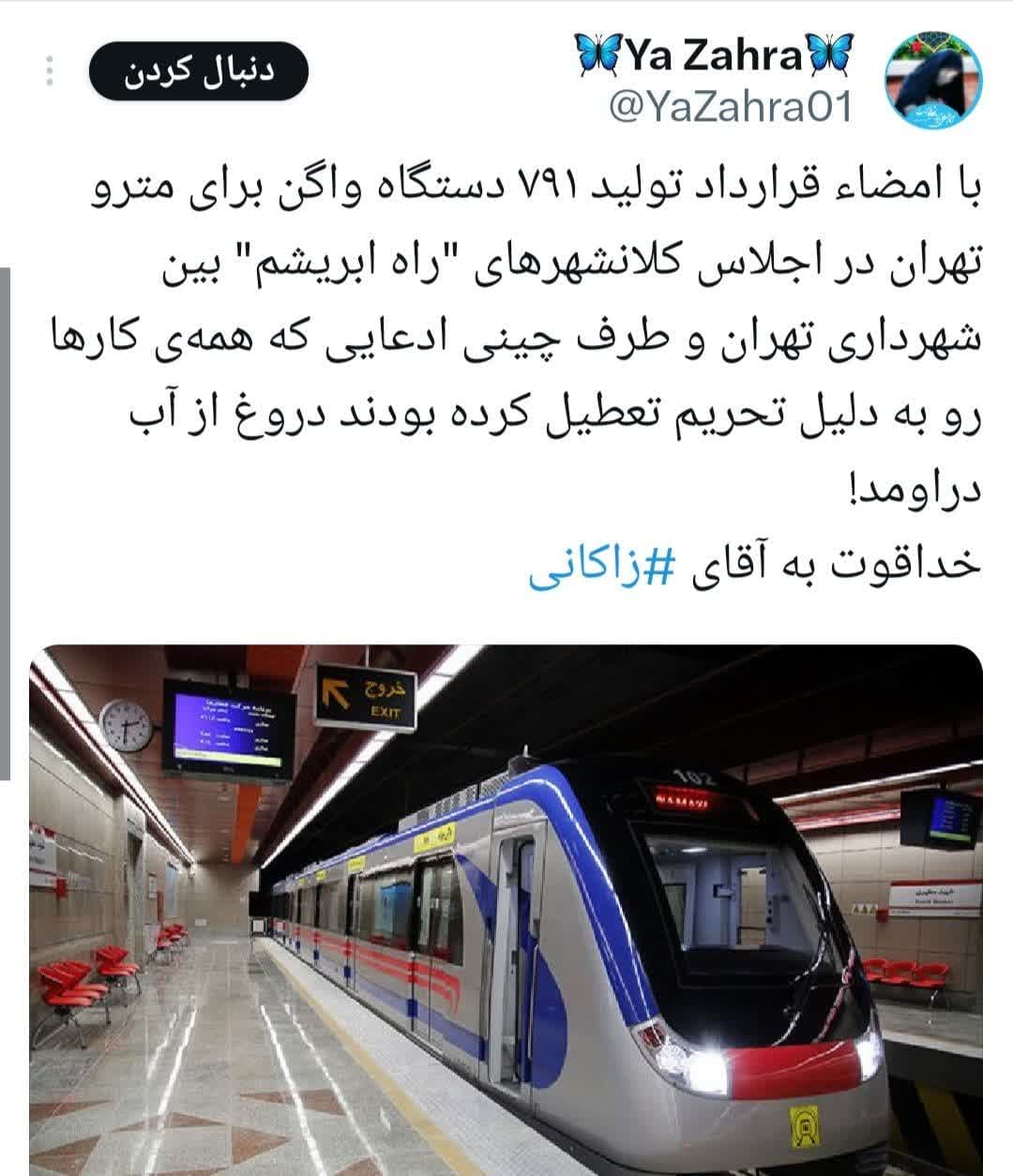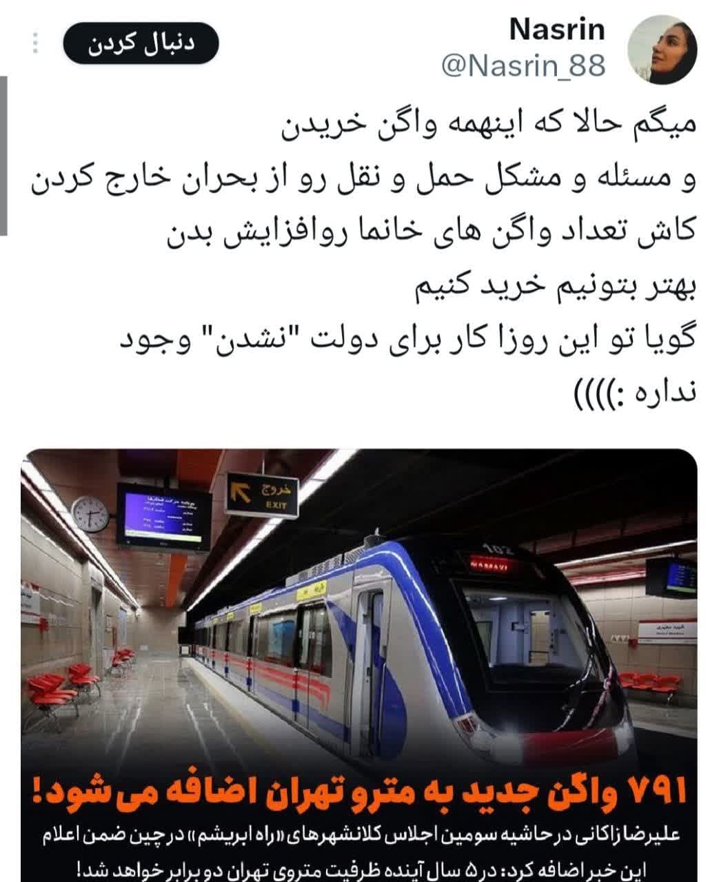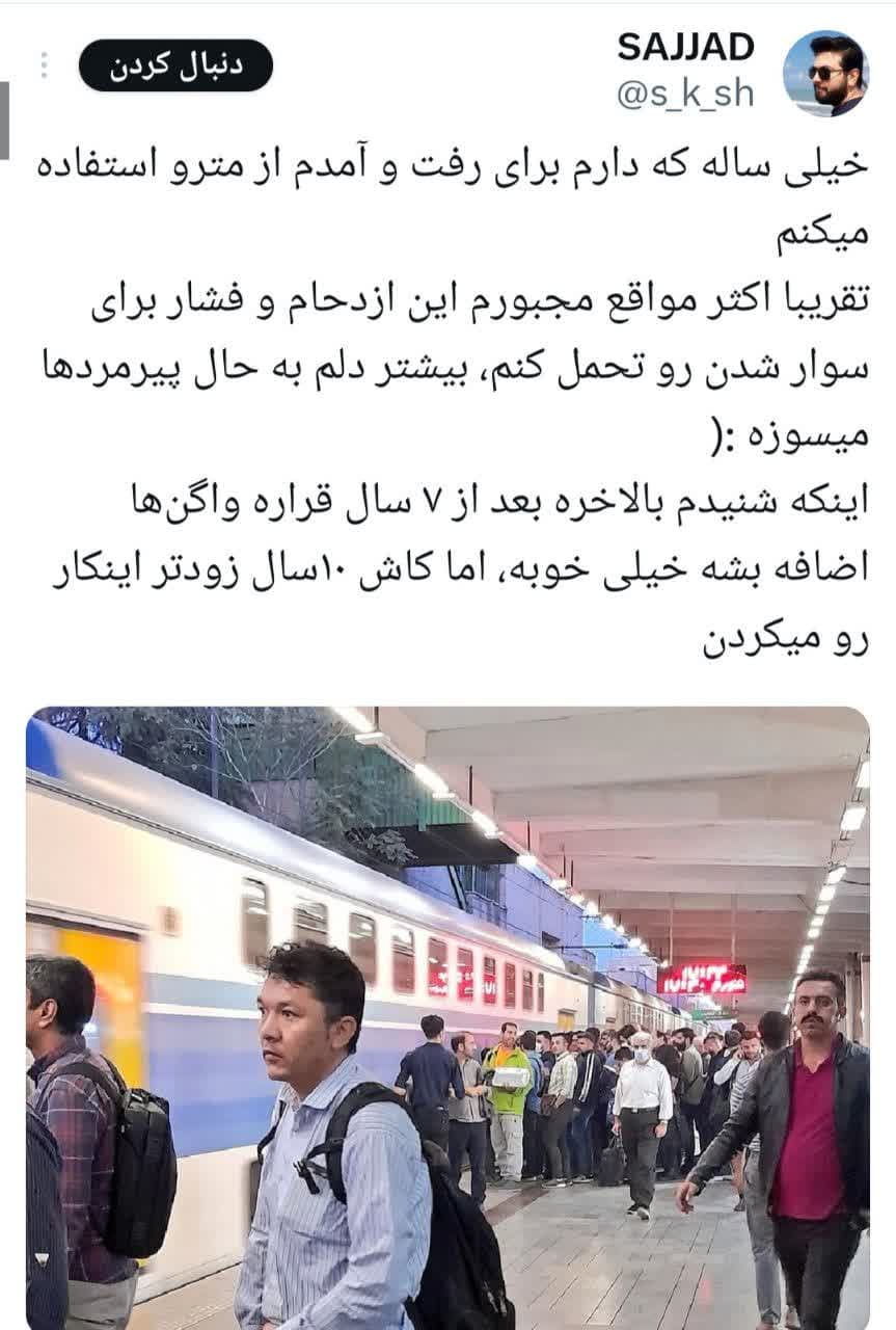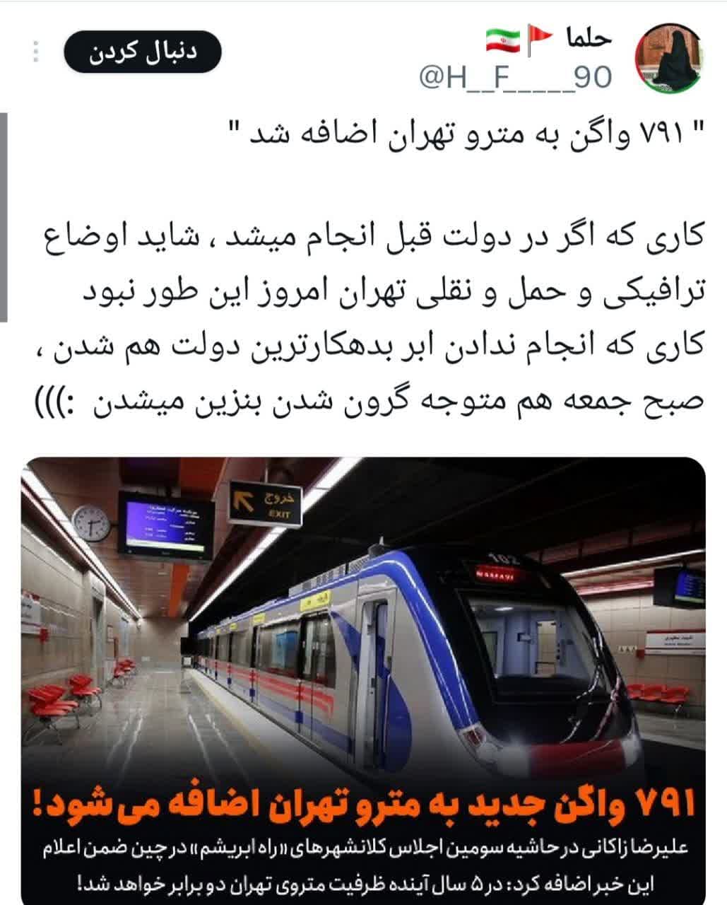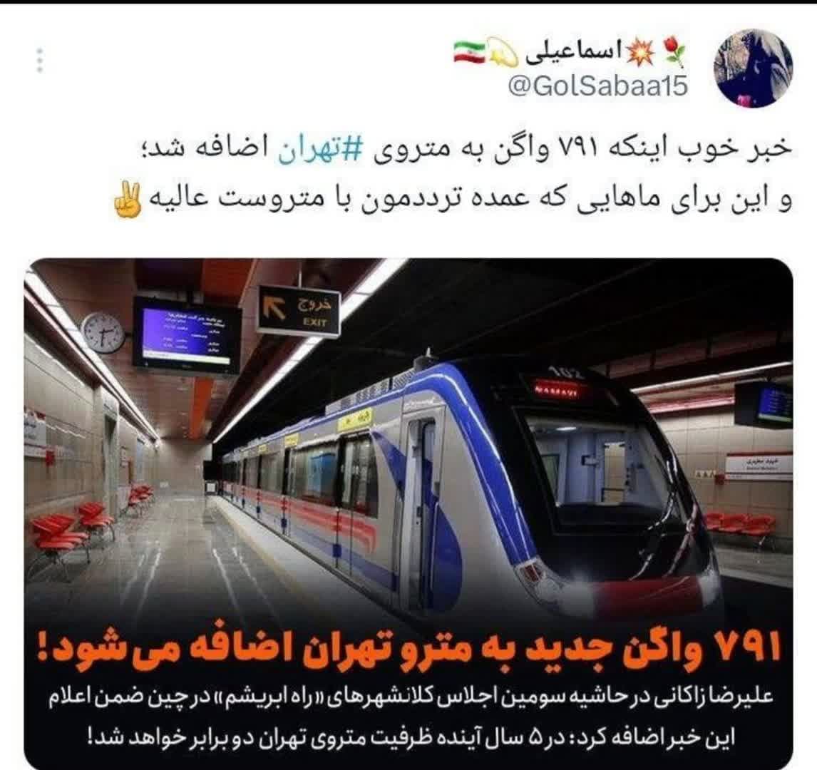«بعد از ۷ سال انتظار، قطارهای مترو تهران 2 برابر میشود و اولین سری قرارداد ۷۹۱ واگن مترو سال آینده به پایتخت میرسد»، این خبری است که در رسانهها منتشرشد و کاربران توییتر به آن واکنش نشان دادند.
