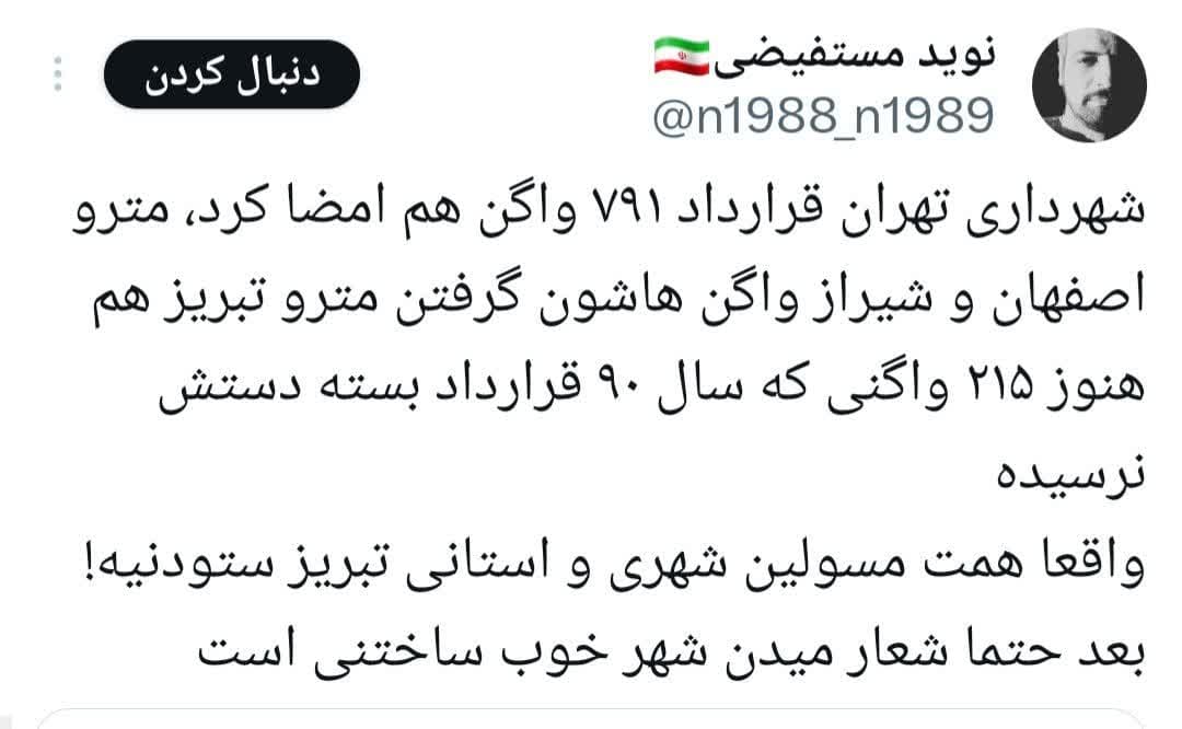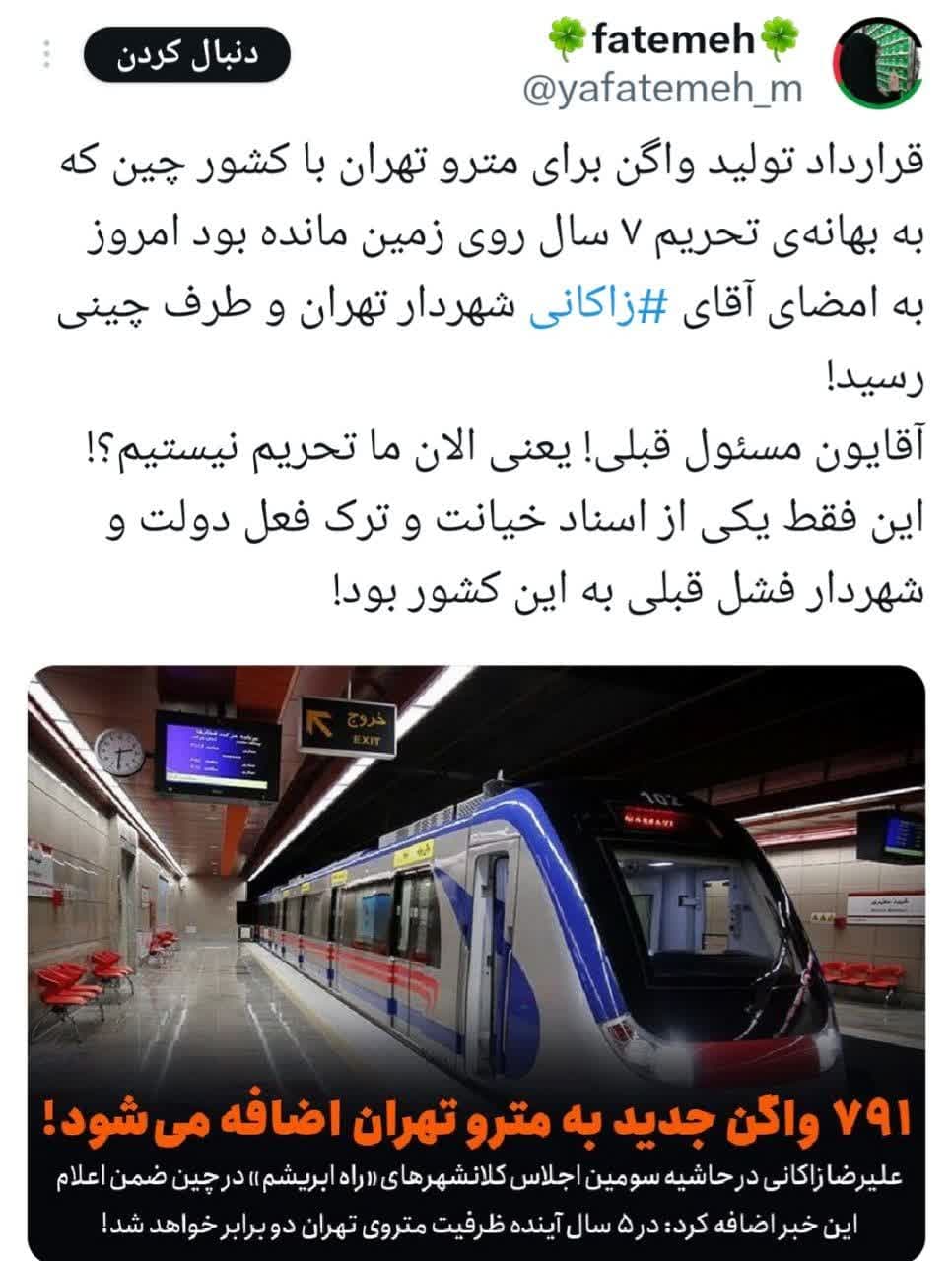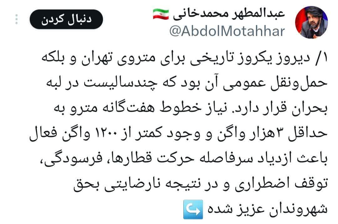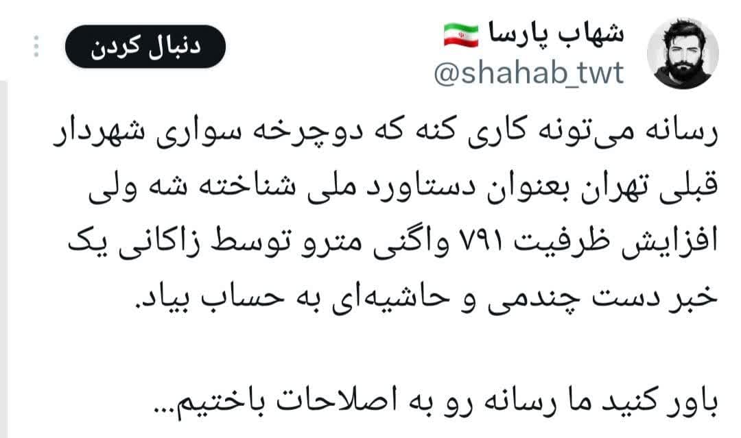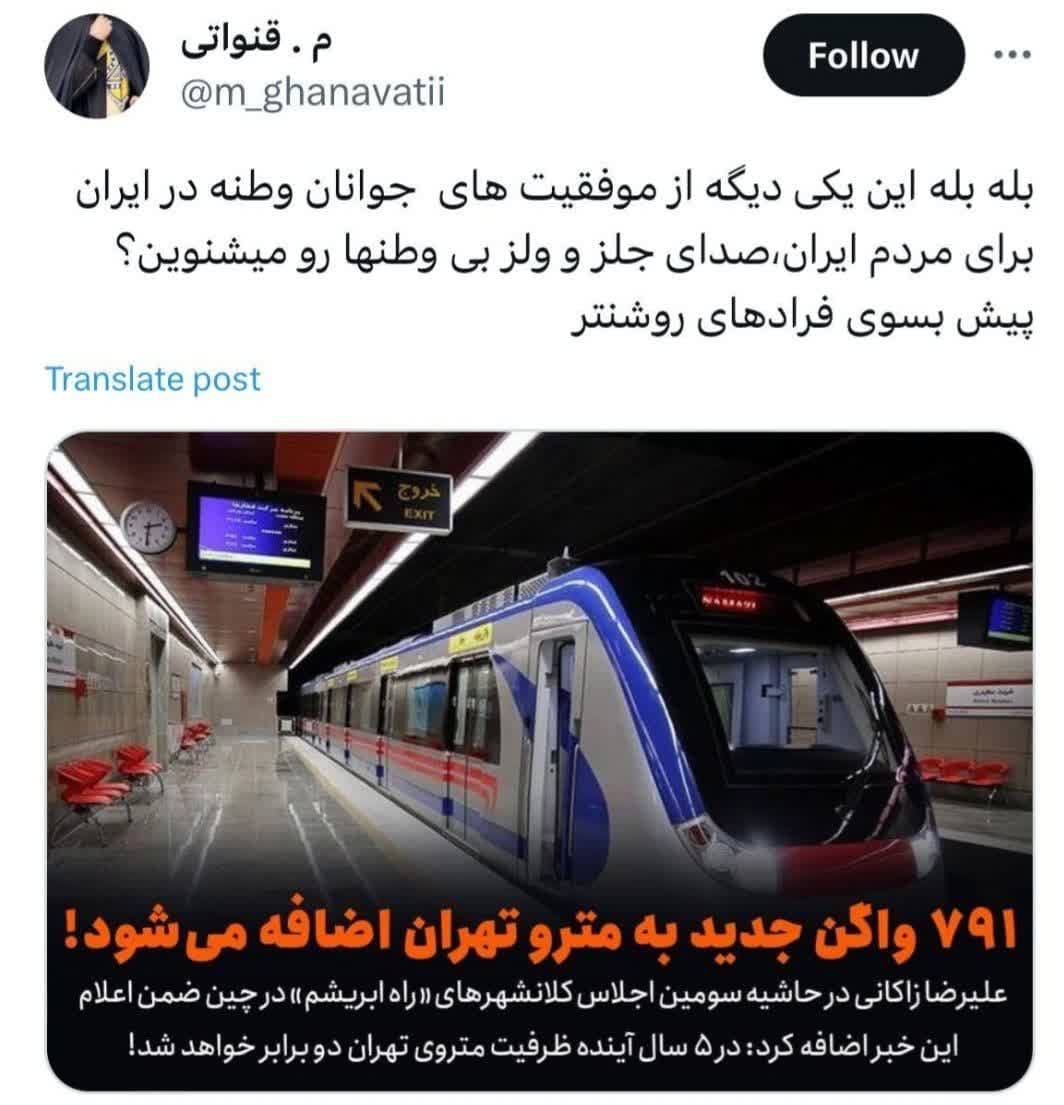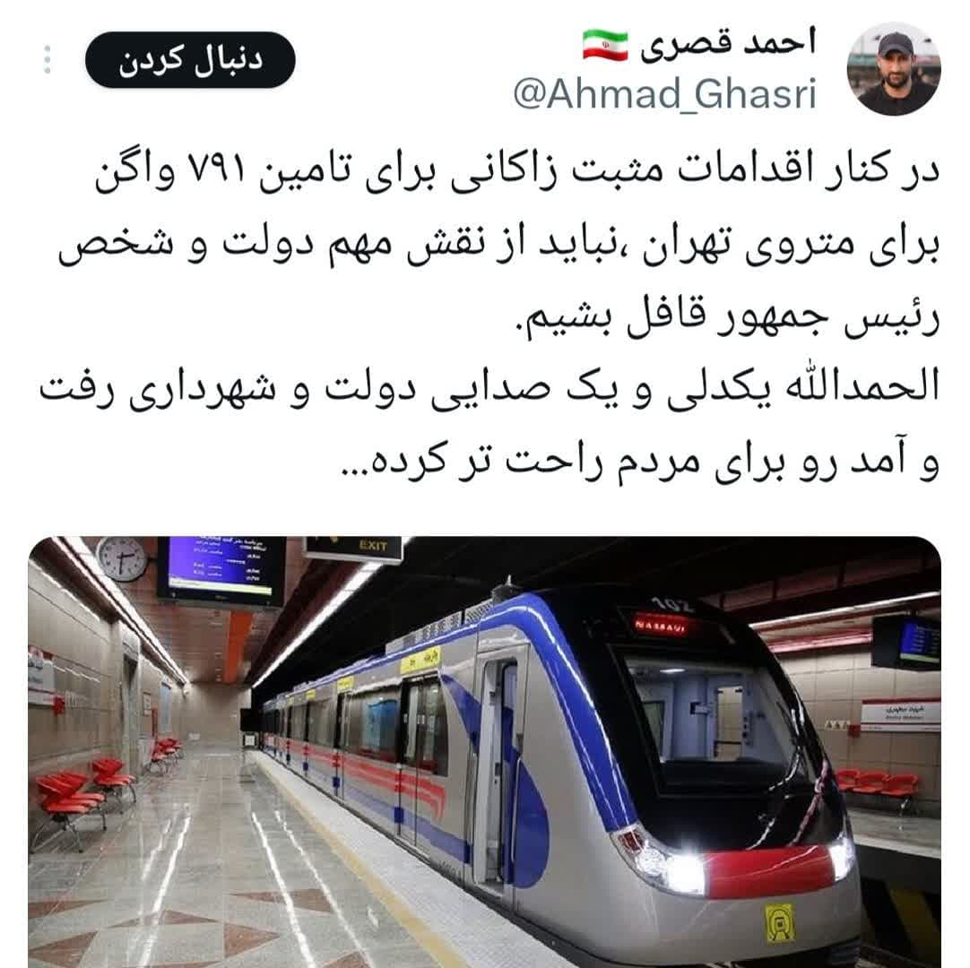 «بعد از ۷ سال انتظار، قطارهای مترو تهران 2 برابر میشود و اولین سری قرارداد ۷۹۱ واگن مترو سال آینده به پایتخت میرسد»، این خبری است که در رسانهها منتشرشد و کاربران توییتر به آن واکنش نشان دادند.