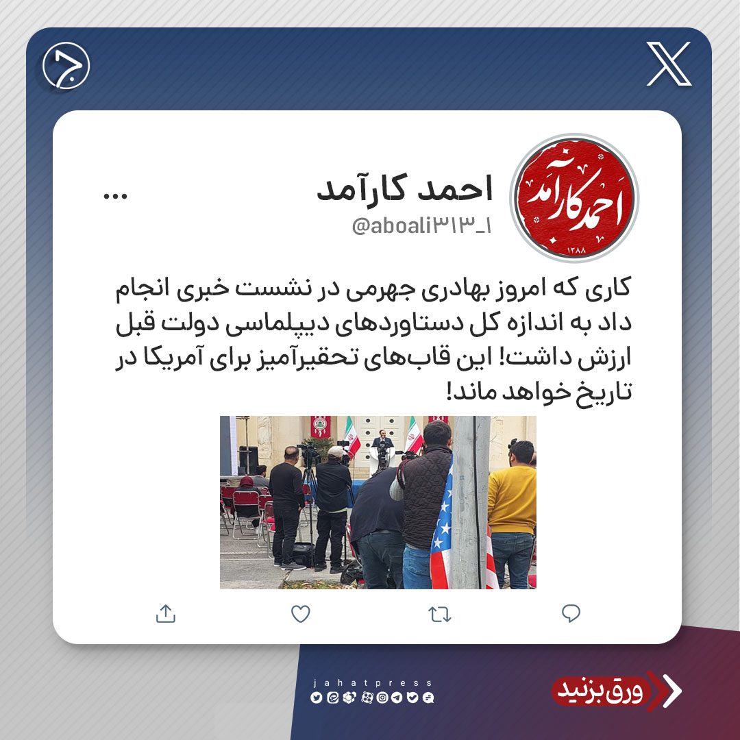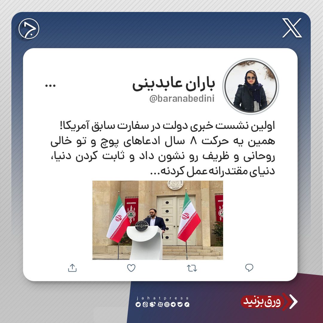 معاون اول دولت سیزدهم برای اولین بار در تاریخ بعد از انقلاب، نشست خبری با خبرنگاران در سفارت سابق آمریکا (لانه جاسوسی) برگزار کرد که از نظر فعالان رسانه‌ای اقدامی پر معنا با پیامی خاص برای ابرقدرت‌ها بود. بهادری جهرمی در این نشست یادآور شد که علت برگزاری نشست در این مکان بابت یادآوری جنایات آمریکا و اقدامات دیکتاتوری آنان با حمایتگری از نظام شاهنشاهی است. ورق بزنید و واکنش فعالان رسانه‌ای به این نشست خبری را ببینید …
