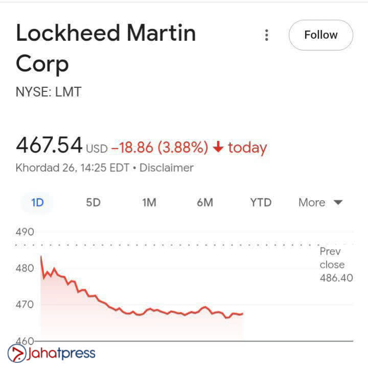 کاهش شدید قیمت سهام شرکت جنگنده سازی آمریکا در پی خبرهایی مبنی بر سرنگونی چهار فروند F-35 توسط ایران.