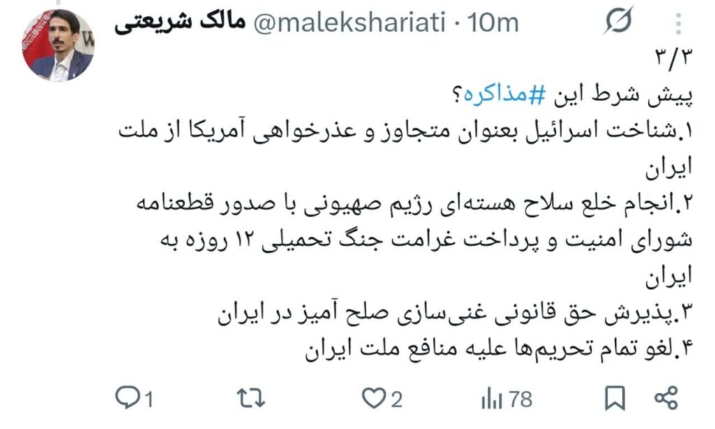 پیش‌شرط‌های مذاکره با آمریکا از زبان مالک شریعتی، نماینده مجلس را مشاهده می کنید.