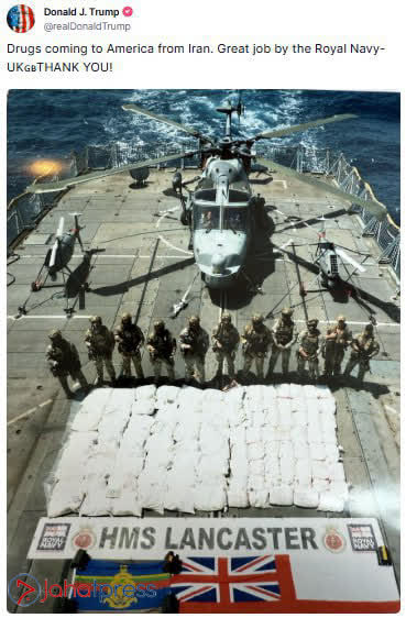 او با انتشار تصویری نامشخص، نوشت: «مواد مخدر ارسال شده از سوی ایران به مقصد آمریکا. نیروی دریایی سلطنتی انگلیس کار فوقالعادهای انجام داد. از شما سپاسگزارم.»