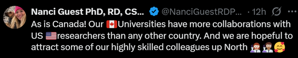 اقدامات ترامپ نهتنها فرصتی را برای اروپا مهیا کرده تا دانشمندان مهم این کشور را جذب کند بلکه سایر کشورهای آمریکای شمالی از جمله کانادا را نیز به فکر جذب نخبگان حاضر در آمریکا انداخته است.کاربری با اشاره به همکاریهای تنگاتنگ محققان کانادایی و آمریکایی نوشته: «دانشگاههای ما در کانادا بیشترین همکاری را با محققان آمریکایی نسبت به هر کشور دیگری دارند و ما امیدواریم برخی از همکاران بسیار ماهر خود را به شمال جذب کنیم.»