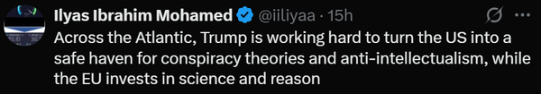 کاربر دیگری هم نوشته که ترامپ دارد آمریکا را به کشوری «ضد روشنفکری» تبدیل میکند، درحالیکه اروپا در حال سرمایهگذاری در علم و منطق است.