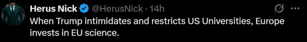 یکی از کاربران با مدرک دکتری نیز به محدودیتهای ترامپ بر دانشگاهها اشاره کرده و نوشته: «وقتی ترامپ دانشگاههای آمریکا را تهدید و محدود میکند، اروپا در زمینه علم در اتحادیه اروپا سرمایهگذاری میکند.»