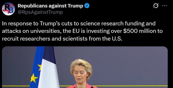 فردی با بازنشر فیلم سخنرانی فندرلاین، سیاستهای ترامپ را با اروپا مقایسه کرده و نوشته: «در پاسخ به کاهش بودجه تحقیقات علمی توسط ترامپ و حملات او به دانشگاهها، اتحادیه اروپا بیش از ۵۰۰ میلیون دلار برای جذب محققان و دانشمندان از ایالات متحده سرمایهگذاری میکند.»