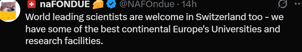 بسیاری از کاربران اروپایی از تصمیم اتحادیه اروپا برای سرمایهگذاریهای علمی حمایت کرده و دانشمندان را به کشورهای خود دعوت کردهاند. فردی با اشاره به امکانات کشورش، سوئیس، از محققان برای حضور در آن کشور دعوت کرده است.