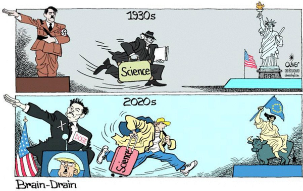 اروپا در حالی حمایتهای خود از دانشمندان را افزایش داده که در نقطه مقابل، رئیسجمهور آمریکا دونالد ترامپ با کاهش بودجههای تحقیقاتی و تحتفشار قرار دادن دانشگاههایی مثل هاروارد، کار را برای دانشمندان در داخل این کشور سخت کرده و بسیاری از پژوهشگران آمریکایی را به فکر مهاجرت انداخته است.