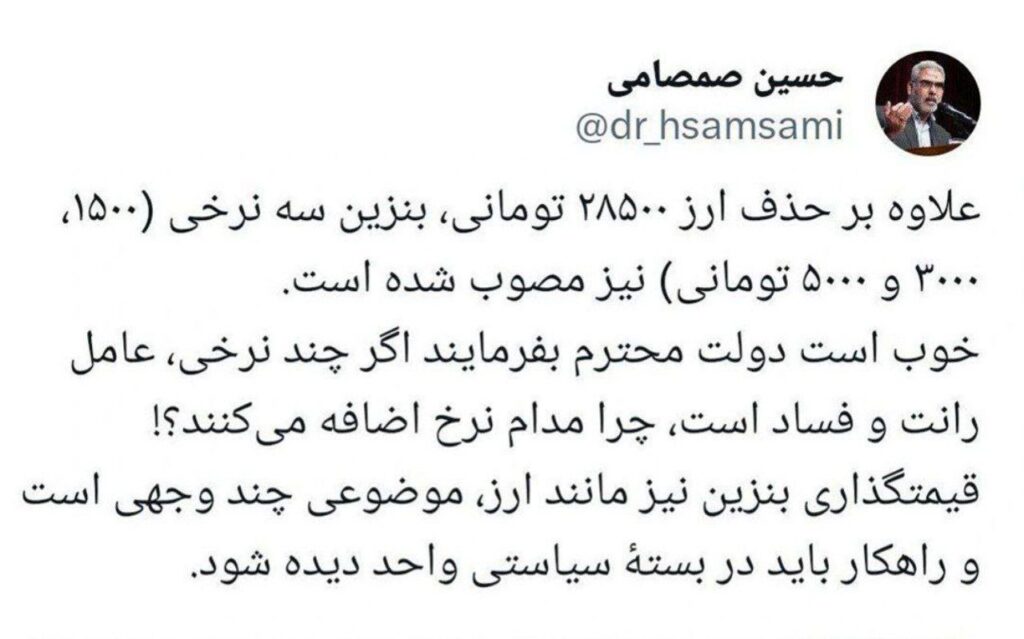 خط انرژی با انتشار توییت نماینده مجلس نوشت: ظاهراً طرح بنزینی دولت بدین صورت است: ۶۰ لیتر بنزین ۱۵۰۰ تومانی ۱۰۰ لیتر بنزین ۳۰۰۰ تومانی مازاد مصرف بنزین ۵۰۰۰ تومانی