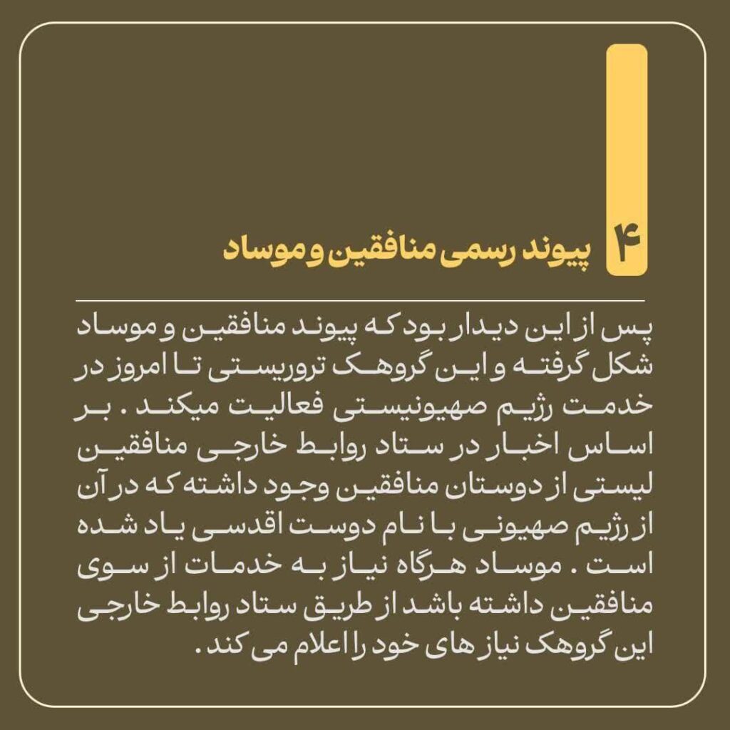این اسناد نشان میدهد پیوند منافقین با موساد و دستگاههای امنیتی غربی، نهتنها یک ارتباط مقطعی نبوده بلکه به یک همکاری سازمانیافته و مستمر تبدیل شده است.
