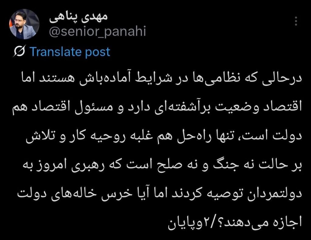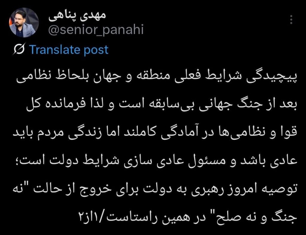 “تقسیم کار بین نظامیان و دولتمردان برای مقابله با رژیم صهیونیستی” ، یک فعال رسانه در تحلیل سخنان رهبری در دیدار با دولتمردان دولت چهاردهم با این مضمون نوشت: درحالی که نظامیها در شرایط آمادهباش هستند اما اقتصاد وضعیت برآشفتهای دارد و مسئول اقتصاد هم دولت است، تنها راهحل هم غلبه روحیه کار و تلاش بر حالت نه جنگ و نه صلح است که رهبری امروز به دولتمردان توصیه کردند اما آیا خرس خالههای دولت اجازه میدهند؟