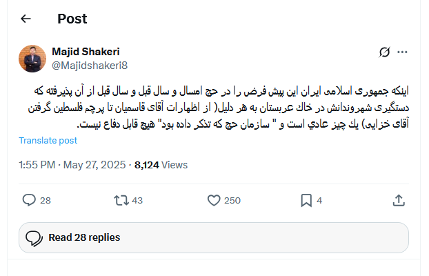 فعال توییتری در صفحه توییتر خود نوشت :اينكه جمهورى اسلامى ايران اين پيش فرض را در حج امسال و سال قبل و سال قبل از آن پذيرفته كه دستگيرى شهروندانش در خاك عربستان به هر دليل( از اظهارات آقاى قاسميان تا پرچم فلسطين گرفتن آقاى خزايى) يك چيز عادي است و ” سازمان حج كه تذكر داده بود” هيچ قابل دفاع نيست.