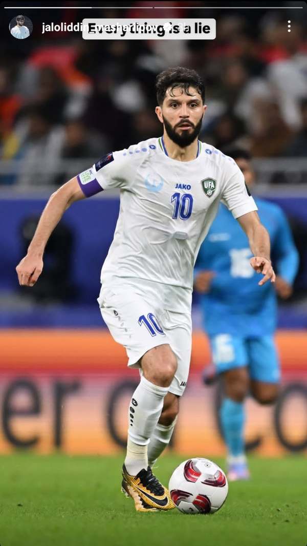 به گزارش جهت پرس؛ جلالالدین ماشاریپوف، هافبک ازبکستانی استقلال در استوری اینستاگرامی که دوشنبه منتشر کرد، بالای عکسی از خودش با لباس تیم ملی ازبکستان نوشته است: «همه چیز دروغ است».