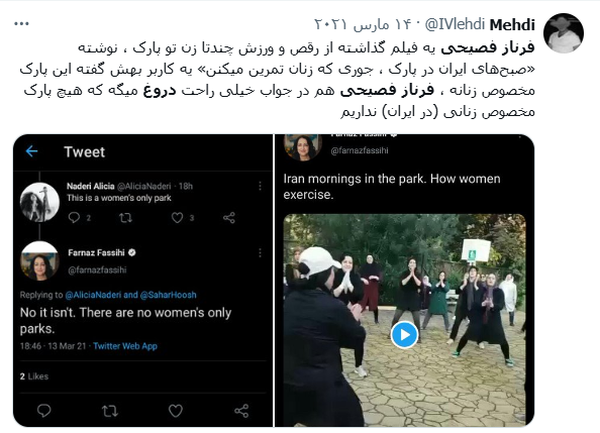 ایران پارک مخصوص بانوان ندارد: خبرنگار ایرانی تبار نیویورکتایمز در خصوص اخبار اجتماعی که از ایران منتشر میکند نیز دچار اشتباهات فاحشی است. فصیحی ورزش بانوان در پارک مخصوص به خودشان را به عنوان یک خبر درباره منتشر کرده بود. درحالی که یکی از افراد در زیر این خبر به وی تذکر میدهد که این پارک مخصوص بانوان است. اما پاسخ میدهد که اصلا پارکی در ایران مخصوص بانوان وجود ندارد!