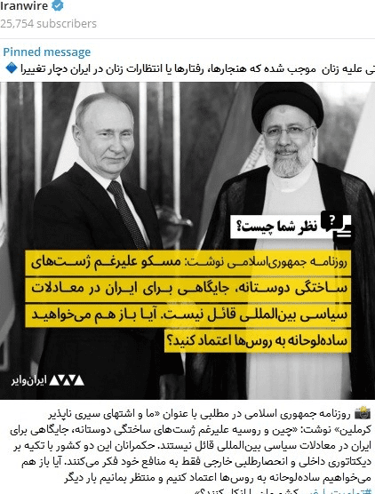 سایت «ایران وایر»- نزدیک به سازمان جاسوسی اسرائیل و فرقه بهاییت- در مطلبی به نقل از روزنامه جمهوری اسلامی نوشت:« روزنامه جمهوری اسلامی در مطلبی با عنوان «ما و اشتهای سیری ناپذیر کرملین» نوشت: «چین و روسیه علیرغم ژستهای ساختگی دوستانه، جایگاهی برای ایران در معادلات سیاسی بینالمللی قائل نیستند. حکمرانان این دو کشور با تکیه بر دیکتاتوری داخلی و انحصارطلبی خارجی فقط به منافع خود فکر میکنند. آیا باز هم میخواهیم سادهلوحانه به روسها اعتماد کنیم و منتظر بمانیم بار دیگر تمامیت ارضی کشورمان را انکار کنند؟»