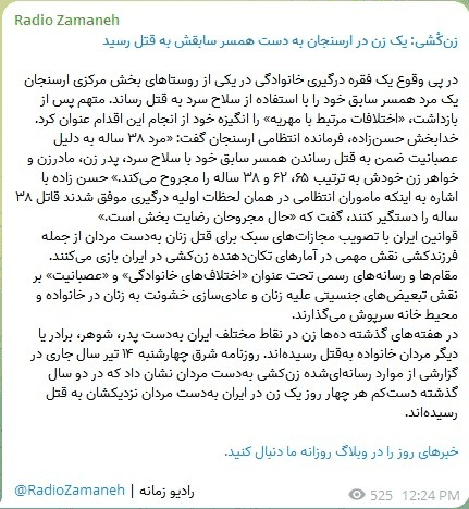 رادیوزمانه در ادامه نوشت:«در هفتههای گذشته دهها زن در نقاط مختلف ایران بهدست پدر، شوهر، برادر یا دیگر مردان خانواده بهقتل رسیدهاند. روزنامه شرق چهارشنبه ۱۴ تیر سال جاری در گزارشی از موارد رسانهایشده زنکشی بهدست مردان نشان داد که در دو سال گذشته دستکم هر چهار روز یک زن در ایران بهدست مردان نزدیکشان به قتل رسیدهاند.»