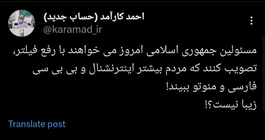 احمد کارامد مدیر مسئول جهت پرس در انتقاد از تلاش دولت برای رفع فیلتر اعلام کرد با این کار مردم را به سمت اینترنشنال و بیبیسی سوق میدهیم.