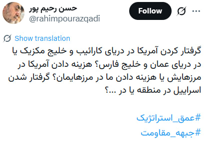 رحیمپور ازغدی در تازهترین توئیت خود با طرح پرسشهایی درباره عمق استراتژیک جبهه مقاومت تأکید کرد که راهبرد صحیح، گرفتار کردن آمریکا در مرزهای خودش و محدود کردن اسرائیل در منطقه است، نه هزینهدادن ایران در مرزهای خود.