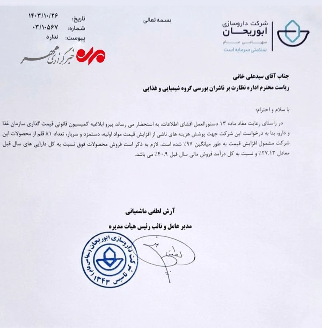همچنین؛ مدیرعامل شرکت داروسازی ابوریحان با ارسال نامهای به رئیس اداره نظارت بر ناشران بورسی گروه شیمیایی و غذایی افزایش قیمت ۸۱ قلم از محصولات این شرکت را با میانگین ۹۷ درصد افزایش اعلام کرد.