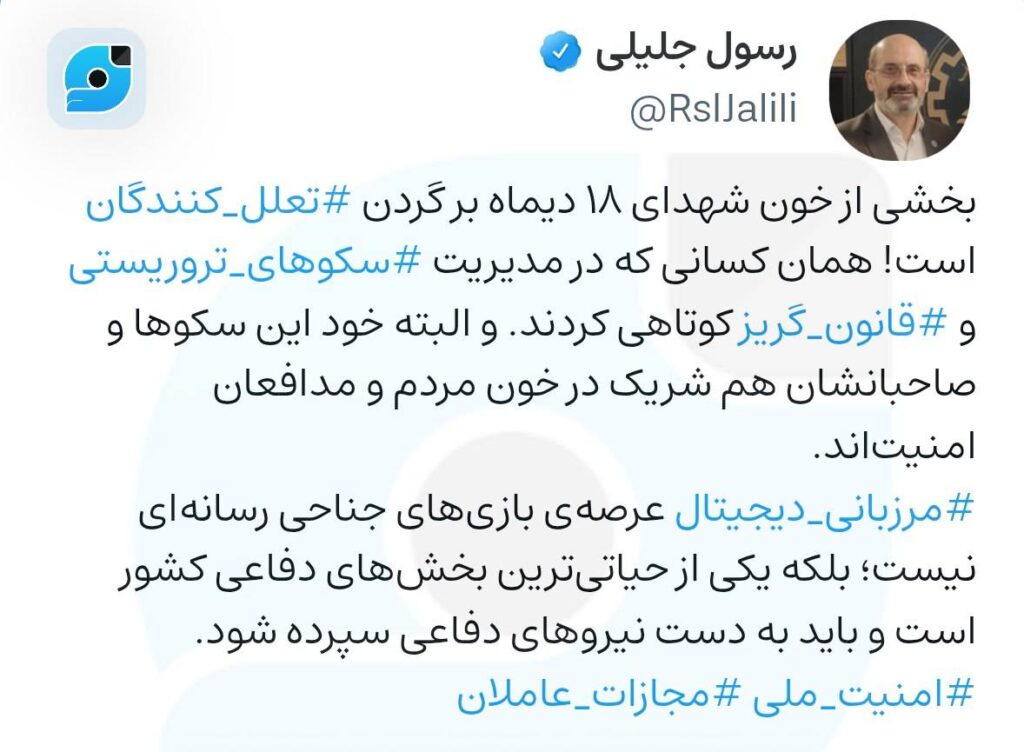 به گزارش جهت پرس؛ عضو شورای عالی فضای مجازی کشور:بخشی از خون شهدای ۱۸ دیماه بر گردن #تعلل_کنندگان است! همان کسانی که در مدیریت #سکوهای_تروریستی و #قانون_گریز کوتاهی کردند. و البته خود این سکوها و صاحبانشان هم شریک در خون مردم و مدافعان امنیتاند.#مرزبانی_دیجیتال عرصهی بازیهای جناحی رسانهای نیست؛ بلکه یکی از حیاتیترین بخشهای دفاعی کشور است و باید به دست نیروهای دفاعی سپرده شود.
