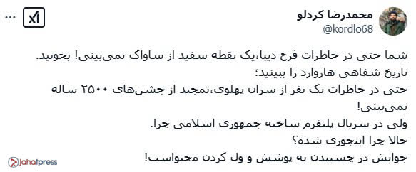 به گزارش جهت پرس؛ رضا کردلو فعال فرهنگی در واکنش به سفیدشویی ساواک در سریال تاسیان نوشت: شما حتی در خاطرات فرح دیبا،یک نقطه سفید از ساواک نمیبینی! بخونید. تاریخ شفاهی هاروارد را ببینید؛ حتی در خاطرات یک نفر از سران پهلوی،تمجید از جشنهای ۲۵۰۰ ساله نمیبینی!