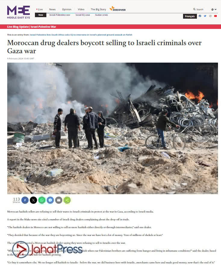 چرا اسرائیلی ها می توانند با فروش حشیش مراکشی امرار معاش کنند در حالی که برادران فلسطینی ما از گرسنگی رنج می برند و در شرایط غیر انسانی زندگی می کنند؟ این فروشنده، مستقر در کوههای ریف، مرکز رشد حشیش، گفت.