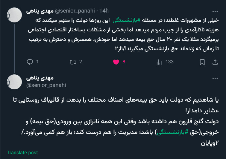 مهدی پناهی، سردبیر خبرگزاری ایسنا نوشت: دولت گنج قارون هم داشته باشد وقتی این همه ناترازی بین ورودی(حق بیمه) و خروجی(حق بازنشستگی) باشد؛ مدیریت را هم درست کند؛ باز هم کمی میآورد.