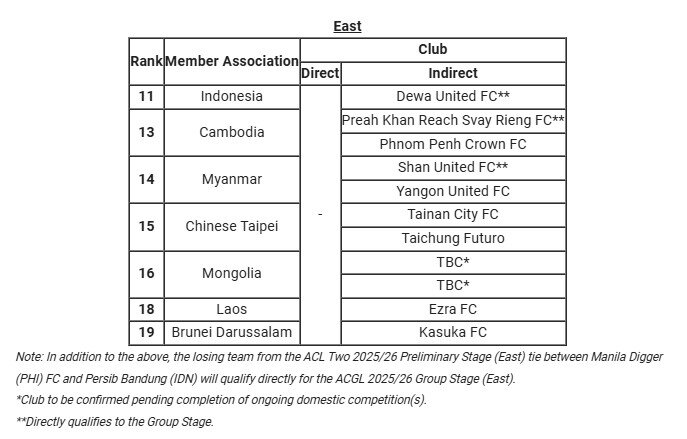 ترکیب تیمها در سه تورنمنت لیگ قهرمانان آسیا الیت (ACL Elite)، لیگ قهرمانان آسیا دو (ACL Two) و لیگ چلنج آسیا (ACGL) بر اساس سهمیههای نهاییشده فصل ۲۶-۲۰۲۵ و فهرست باشگاههای دارای مجوز، مشخص شده است.