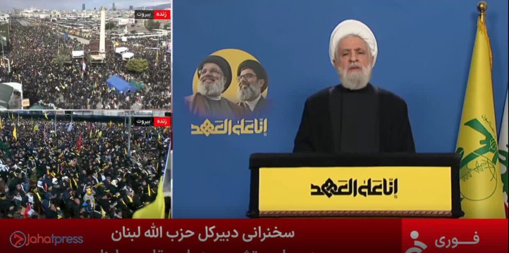 آغاز سخنرانی شیخ نعیم قاسم، دبیر کل حزبالله لبنان، در مراسم تشییع رهبران شهید حزبالله