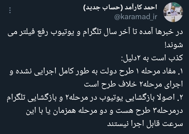 به تازگی در فضای مجازی خبری مبنی بر رفع فیلتر کامل دو پلتفرم خارجی تلگرام و یوتیوب پخش شد، احمدکارآمد با انتشار متنی در صفحه شخصی خود در توییتر از کذب بودن این اخبار نوشت.