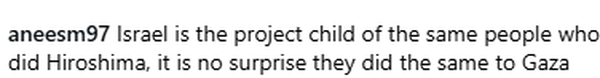 یکی دیگر از کاربران نوشته که اسرائیل، در واقع دستپرورده همان کسانی است که فاجعه هیروشیما را به وجود آوردند و جای تعجب ندارد که همان کار را با غزه کردهاند.