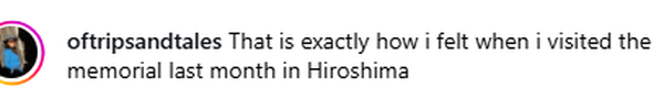 کاربری با اشاره به بازدید خود از یادبود کشتهشدگان هیروشیما تصریح کرده: «دقیقاً همین احساسی را داشتم وقتی ماه گذشته از یادبود هیروشیما بازدید کردم.»